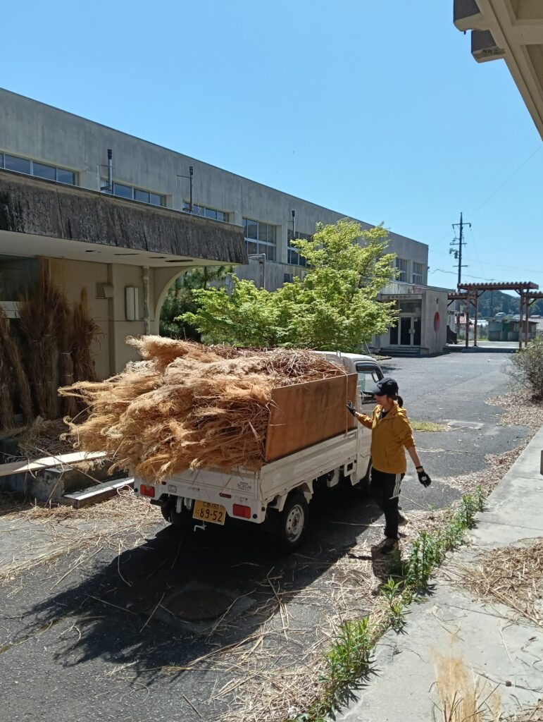 廃校となった小学校から、現場に茅を運びます