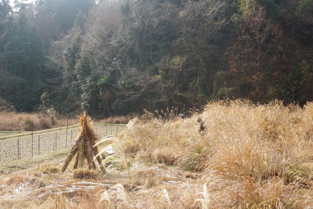 茅刈りの作業中。 写真左にある「茅(かや)ぼうとう」を作ります。